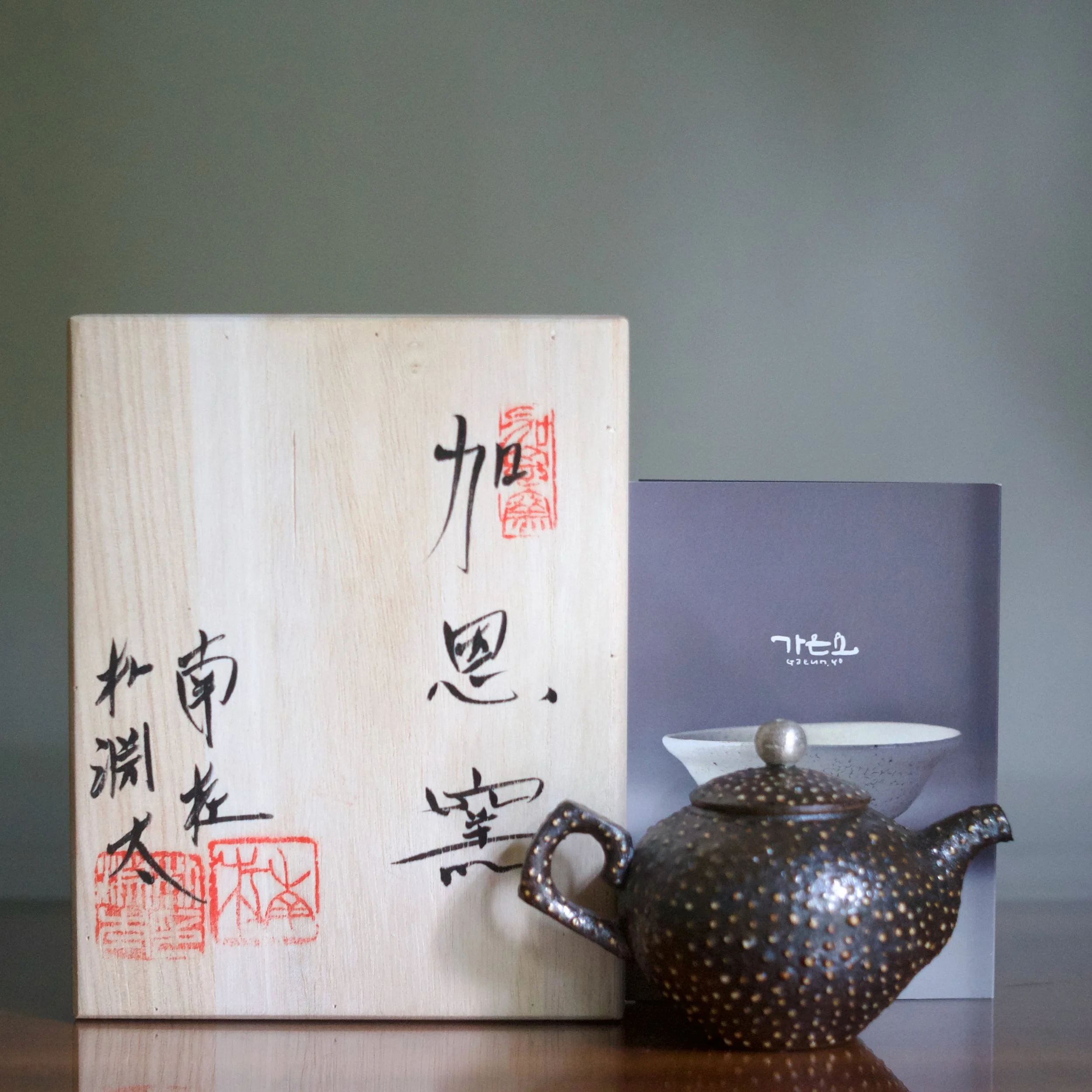 Mungyeong, Gyeongsang; Gaeunyo kiln; 2025. 3 1/4” high to the top of the lid by 5 1/4” long, from handle to spout. Holds about 6 oz. in volume.