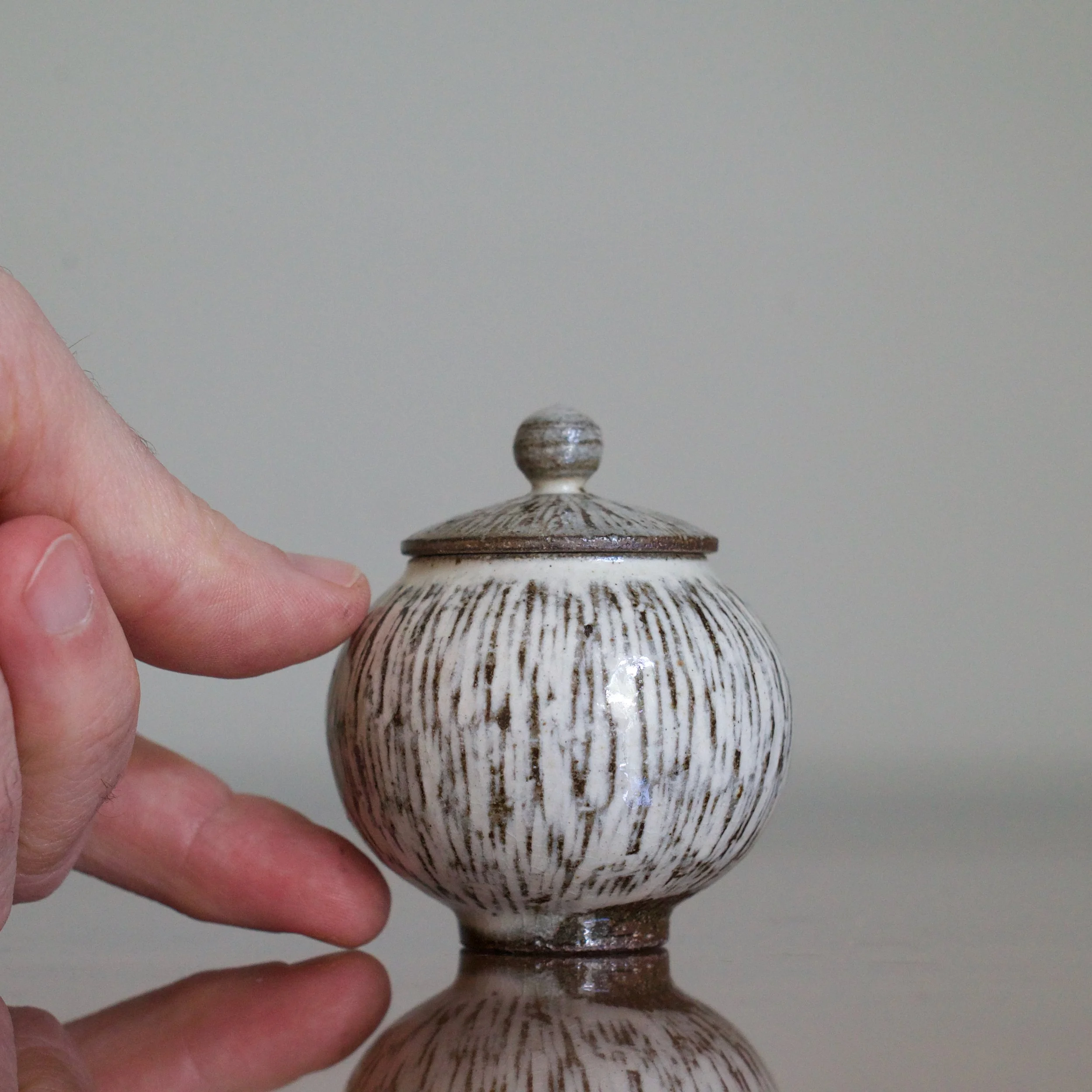 Mungyeong, Gyeongsang; Gaeunyo kiln; 2025. 2 3/4” to the top of the lid by 2 3/8” wide. Holds about 6 oz. in volume.