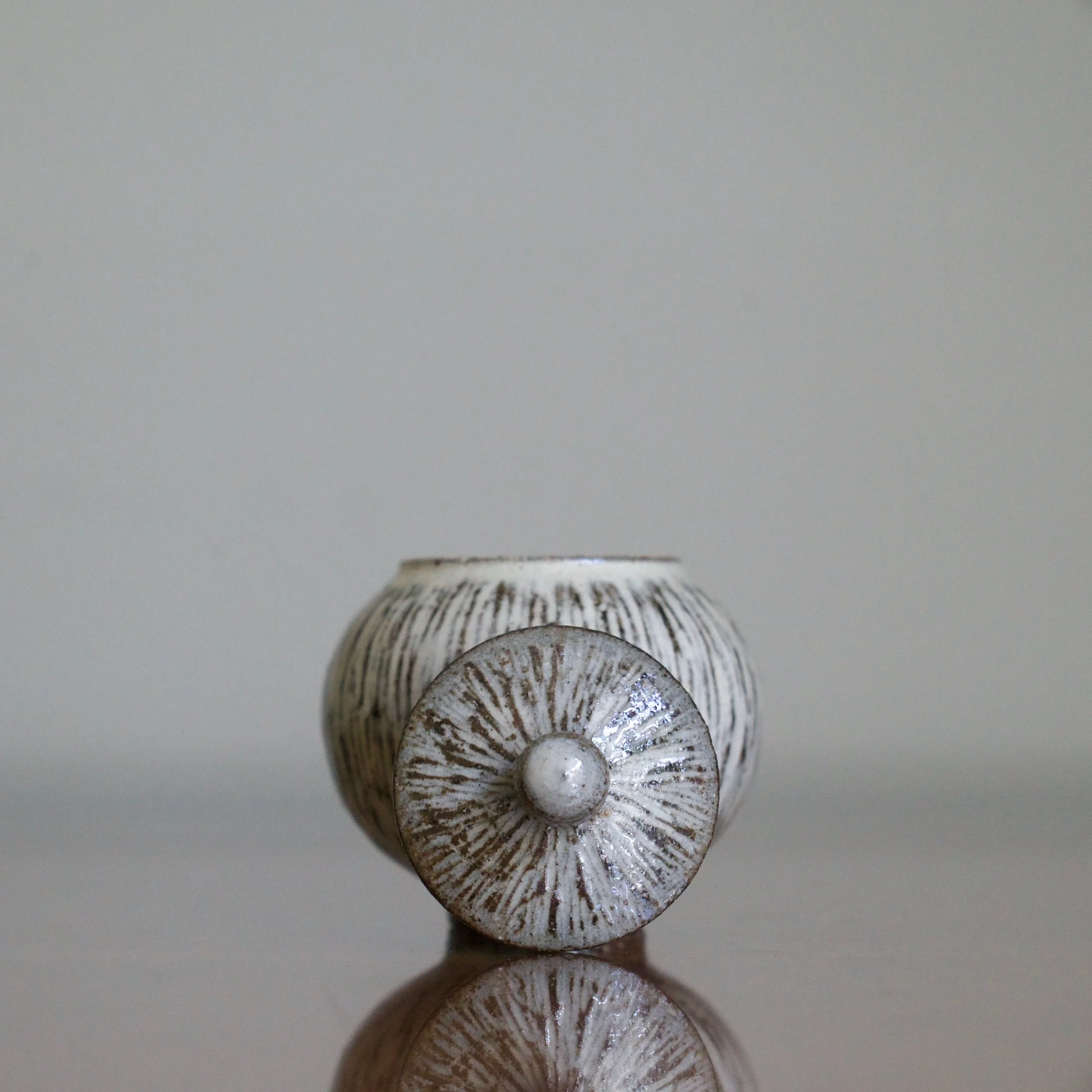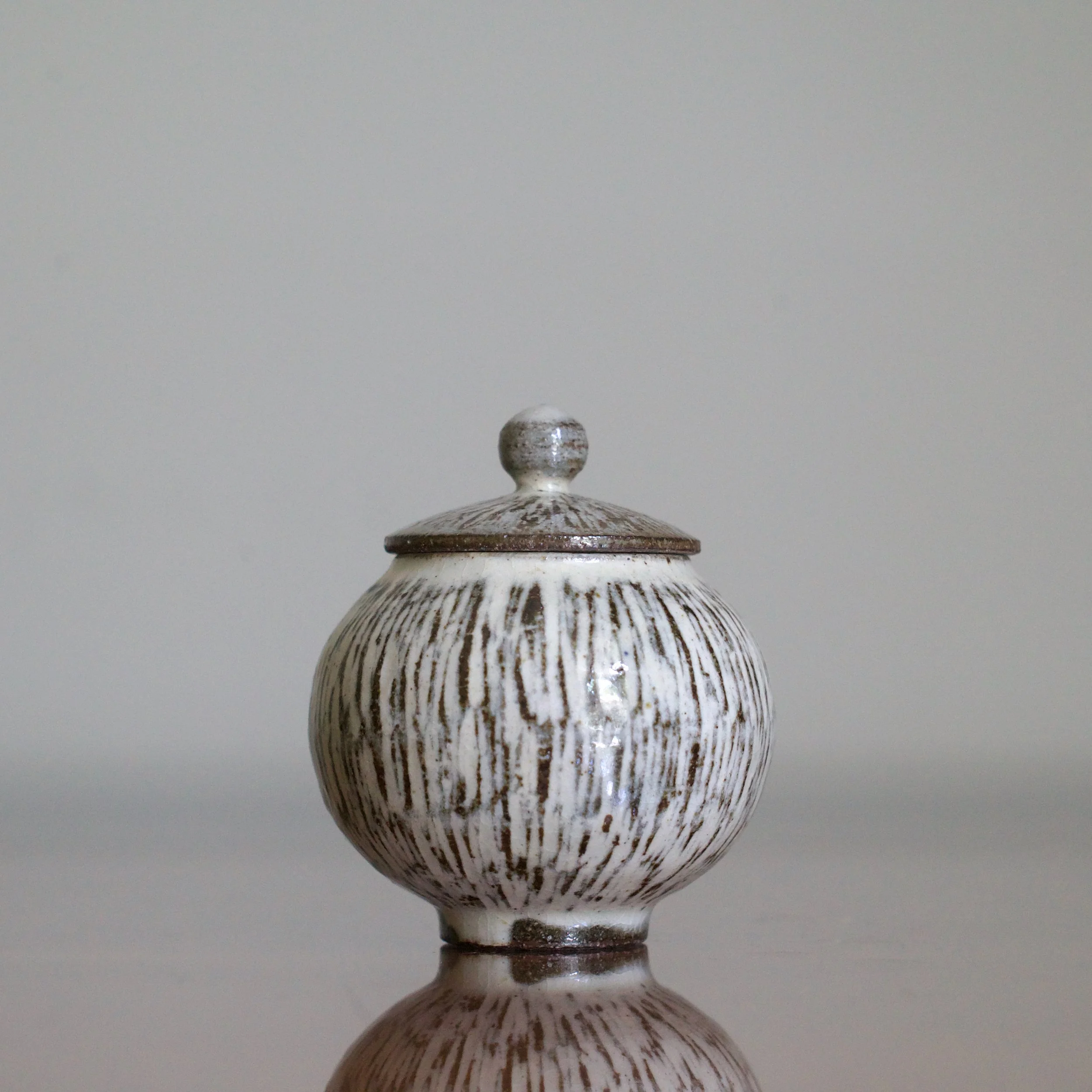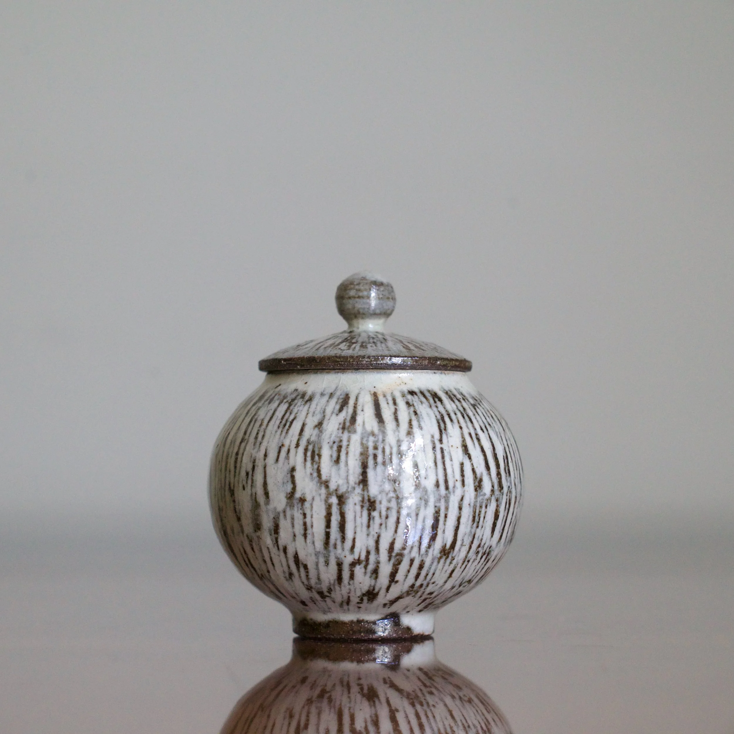 Using dark, iron-rich clay, Yeon tae Park turned this delicate lidded jar meant for holding matcha powdered green tea - or malcha in Korean. After letting the pot dry to a leather-hard stage, he carved the striated pattern down the sides and across the lid. Park filled these lines with a white slip, removing a fine layer to leave it flush with the rest of the pot’s body.