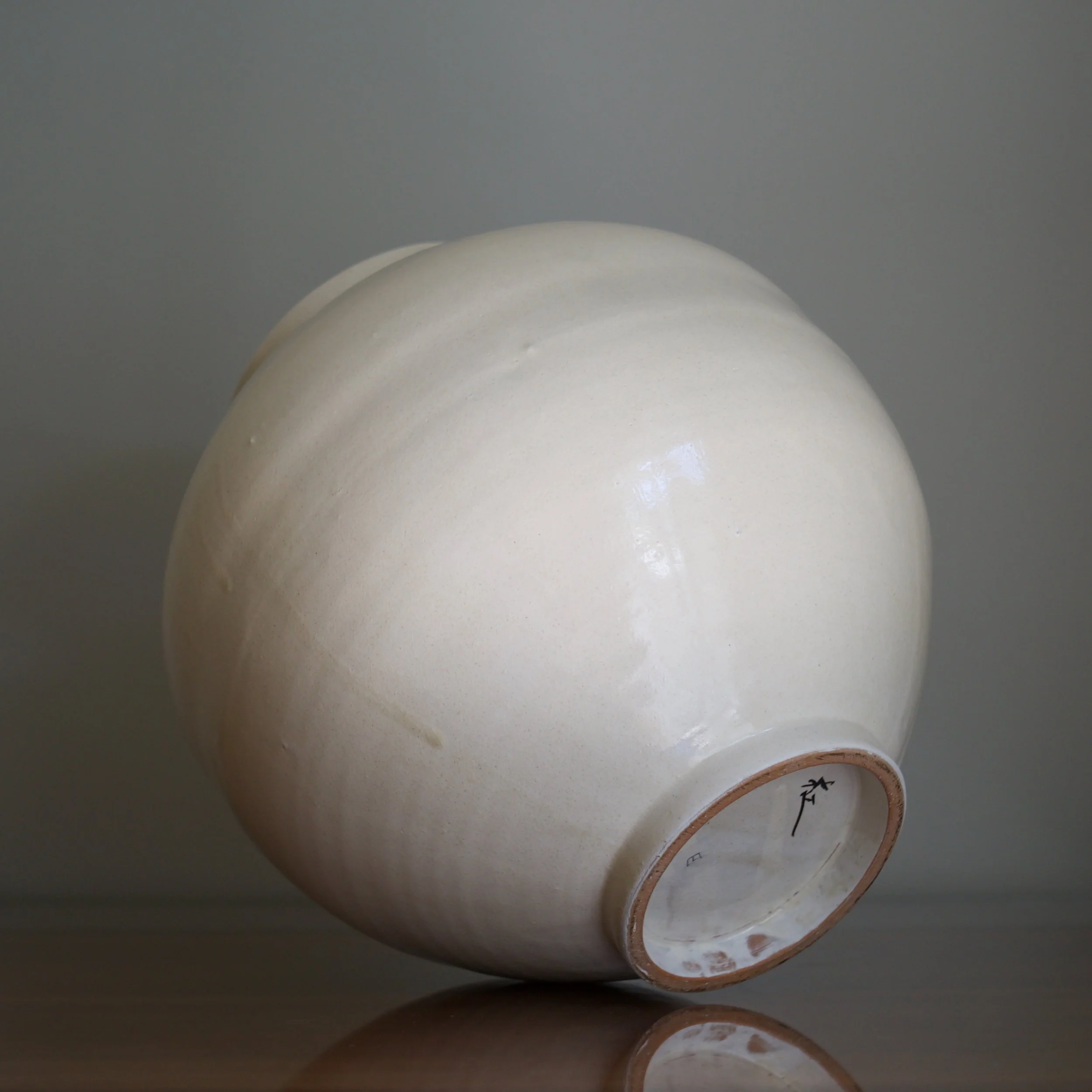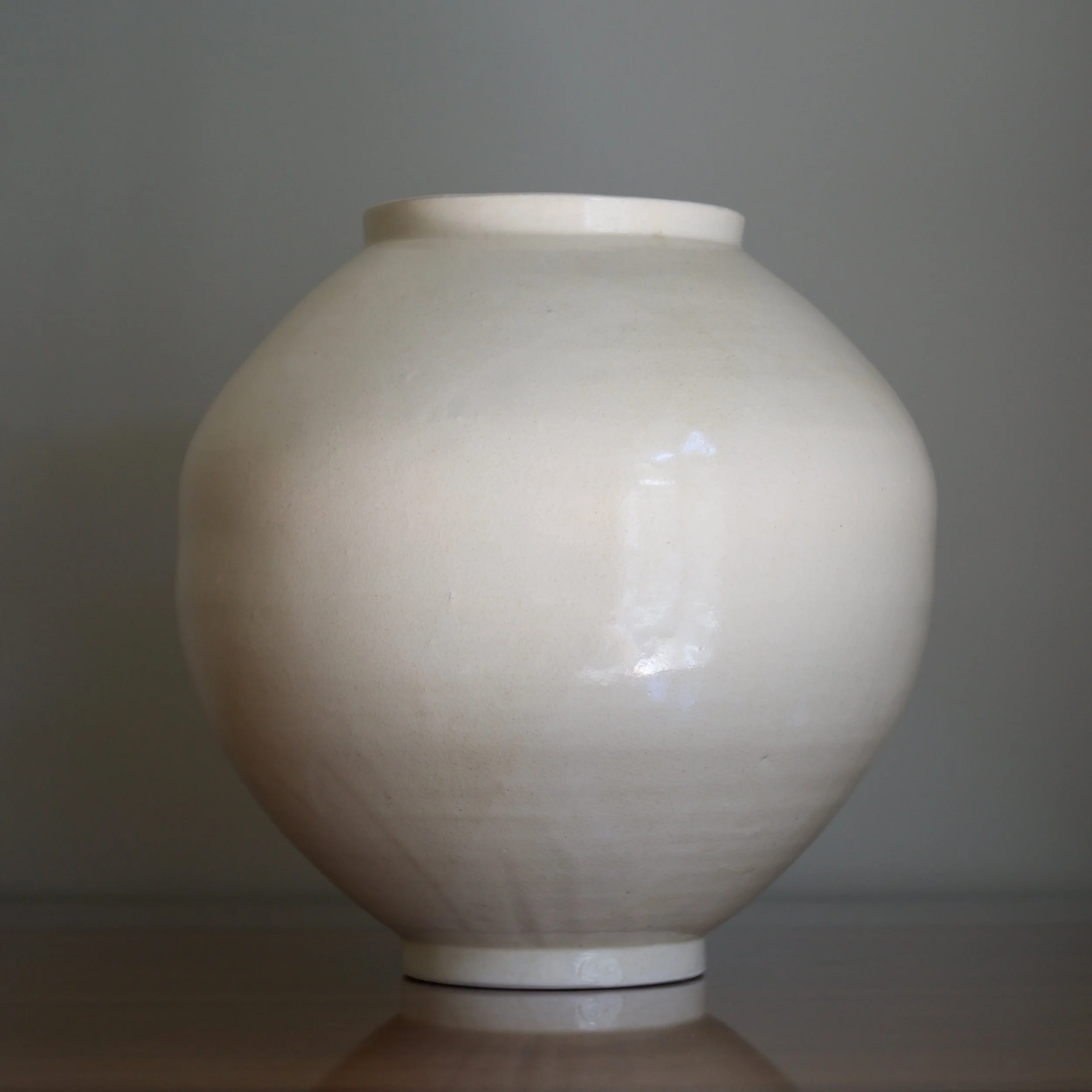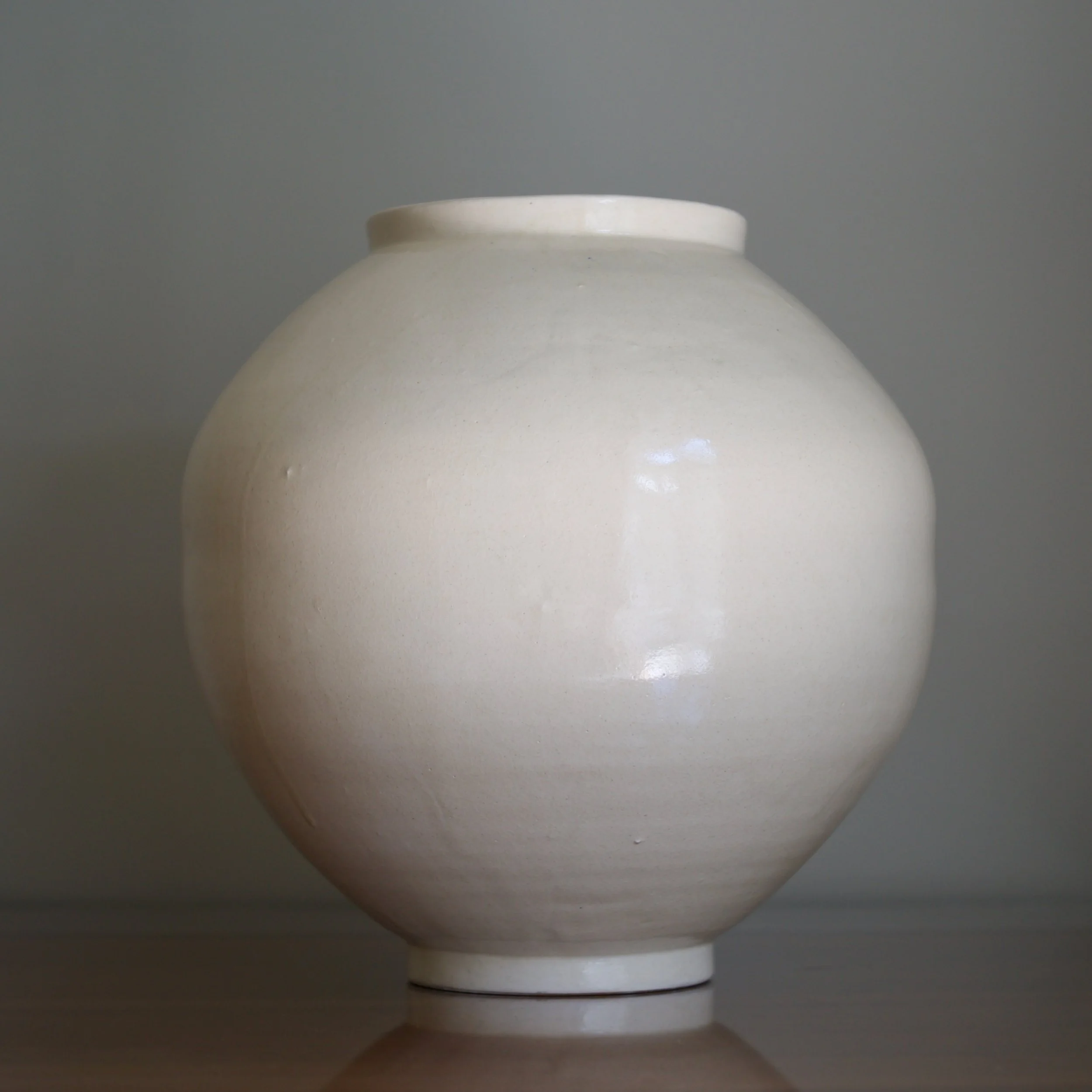 The largest of seven I acquired from Park’s studio, this moon jar stands slightly taller than wide, adding to its already impressive scale. A key buncheong feature, Park’s white slip covers an iron-rich clay, dripping in subtle veils. Upon closer inspection his glaze is alive with subtle crazing and the occasional tiny stone burst and iron bloom.