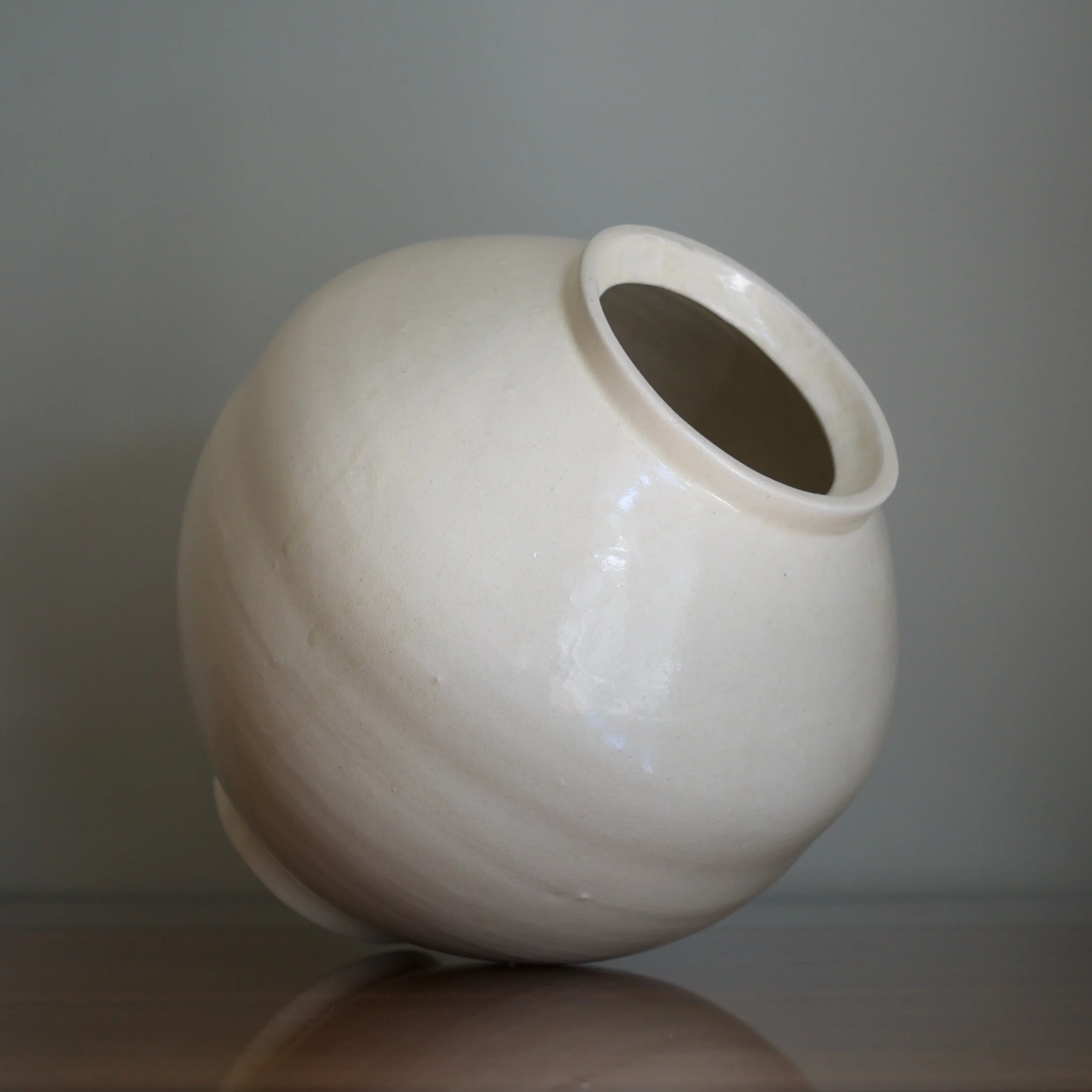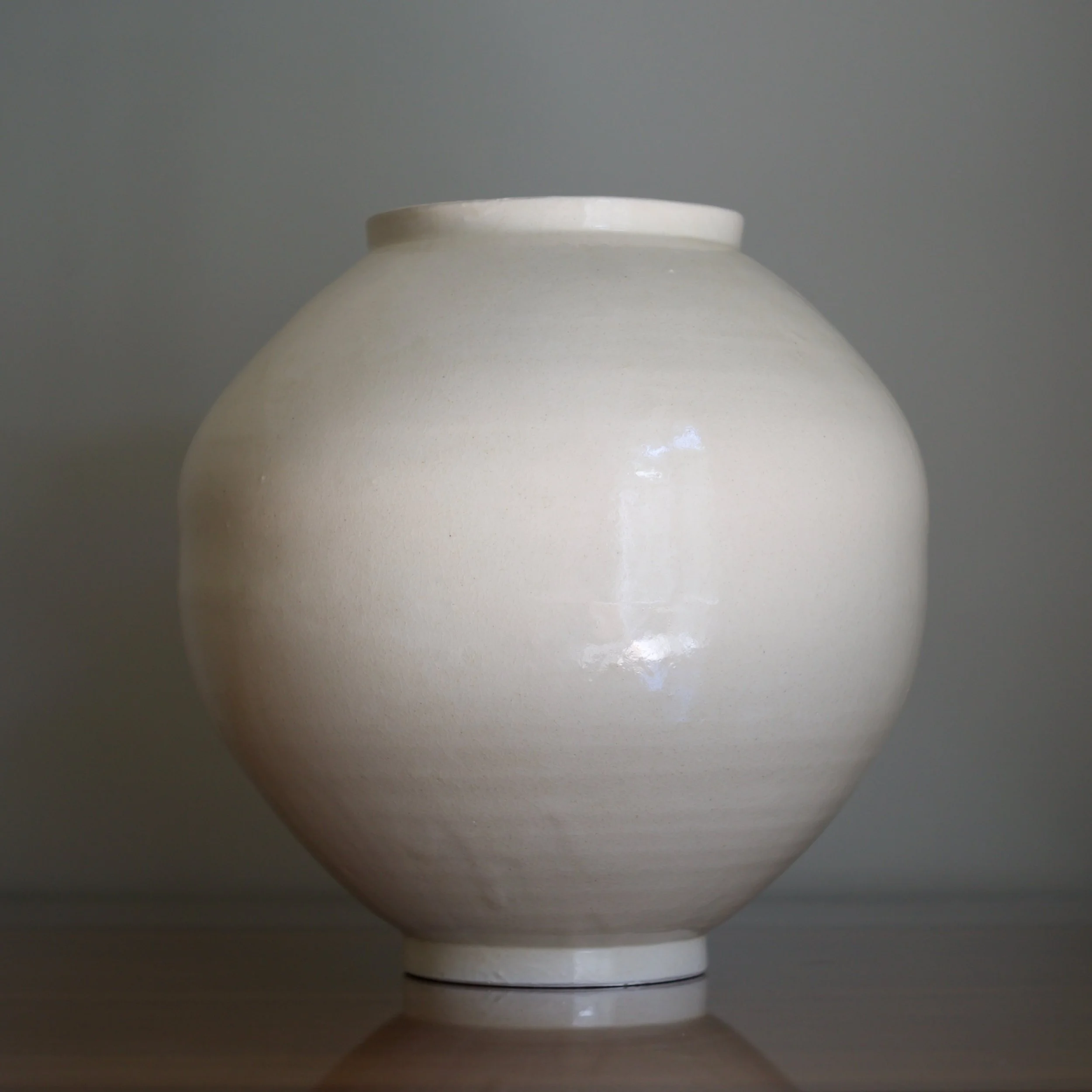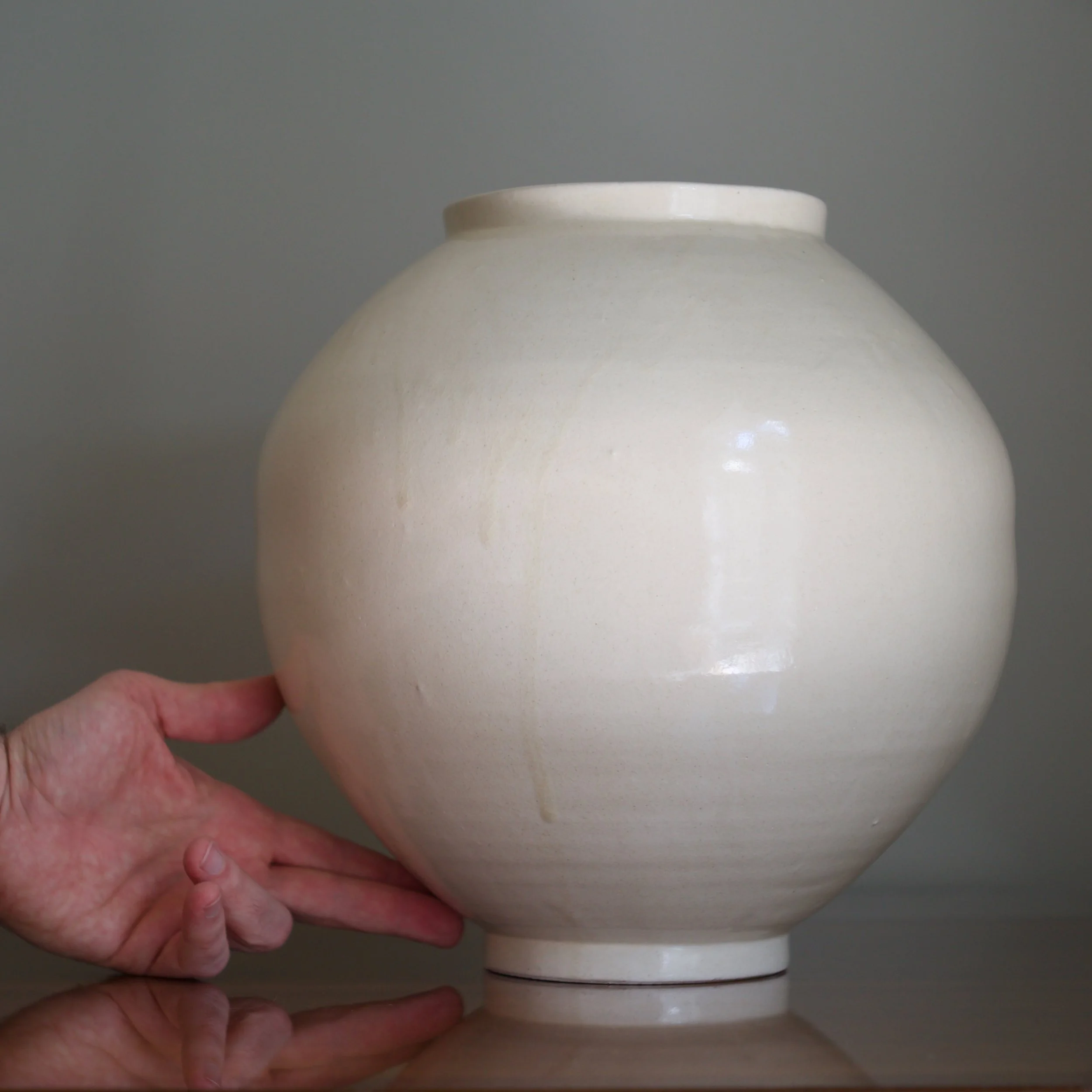The largest of seven I acquired from Park’s studio, this moon jar stands slightly taller than wide, adding to its already impressive scale. A key buncheong feature, Park’s white slip covers an iron-rich clay, dripping in subtle veils. Upon closer inspection his glaze is alive with subtle crazing and the occasional tiny stone burst and iron bloom.
