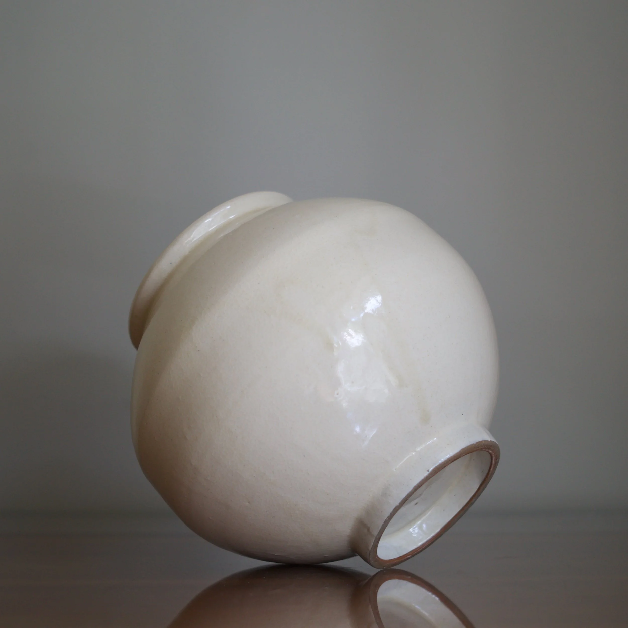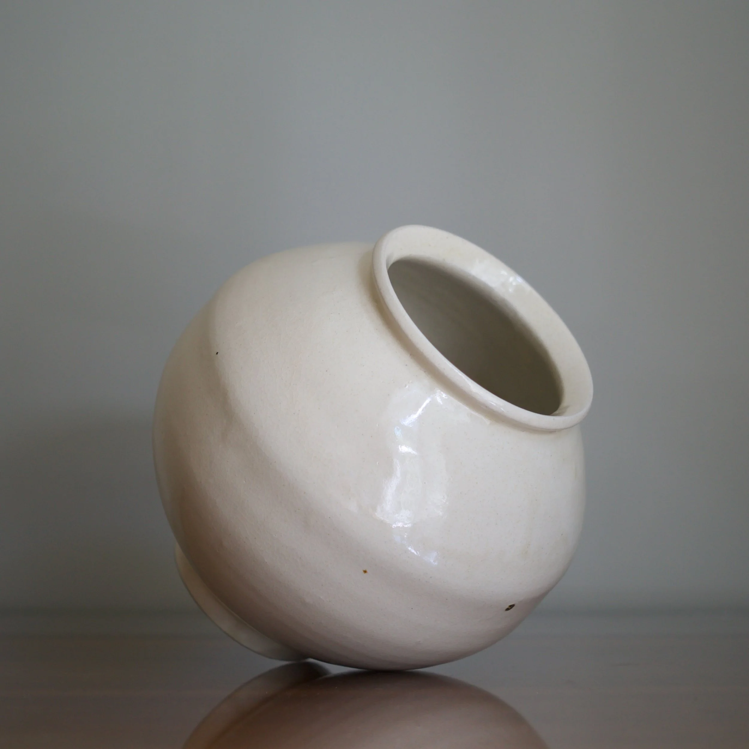 Like floating orbs, Yeon tae Park’s moon jars breathe with wobbly rhythm. Each one is unique, a record of its specific construction. Thrown in two separate parts - top and bottom - and then joined in the centre, a moon jar’s construction lends itself to a vertical asymmetry that has become a signature of the form. The diameter of the foot is also narrower than the mouth, adding an unstable tension.
