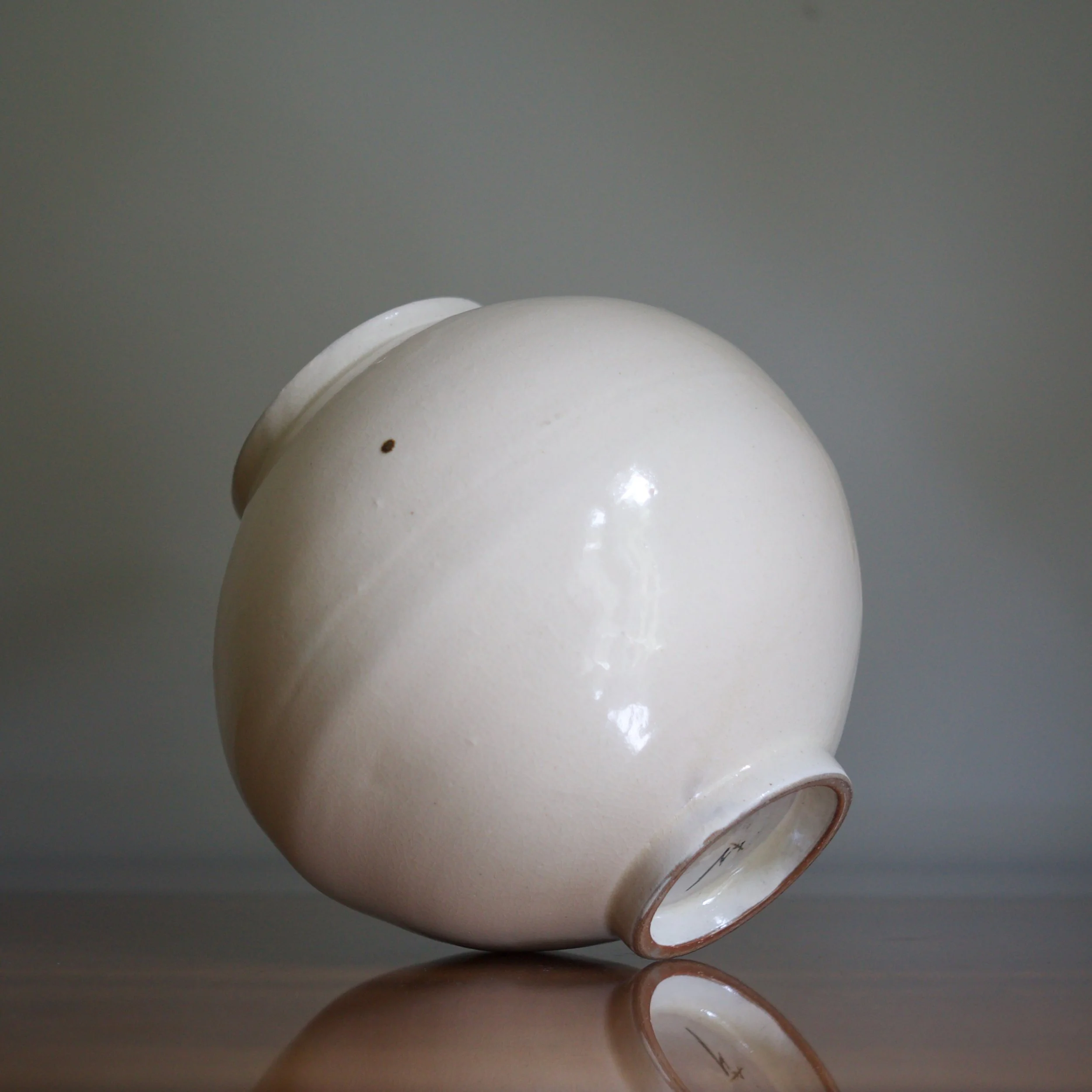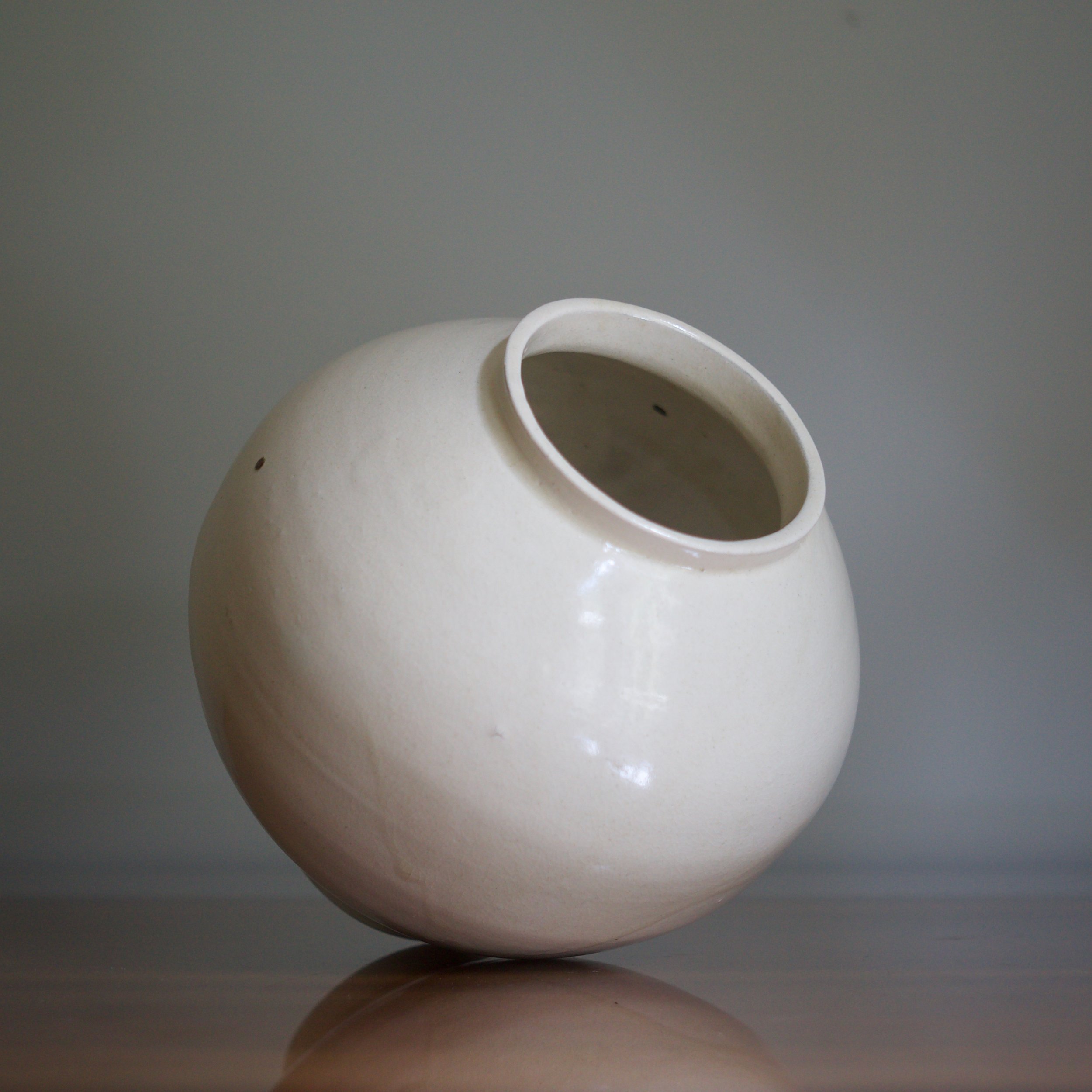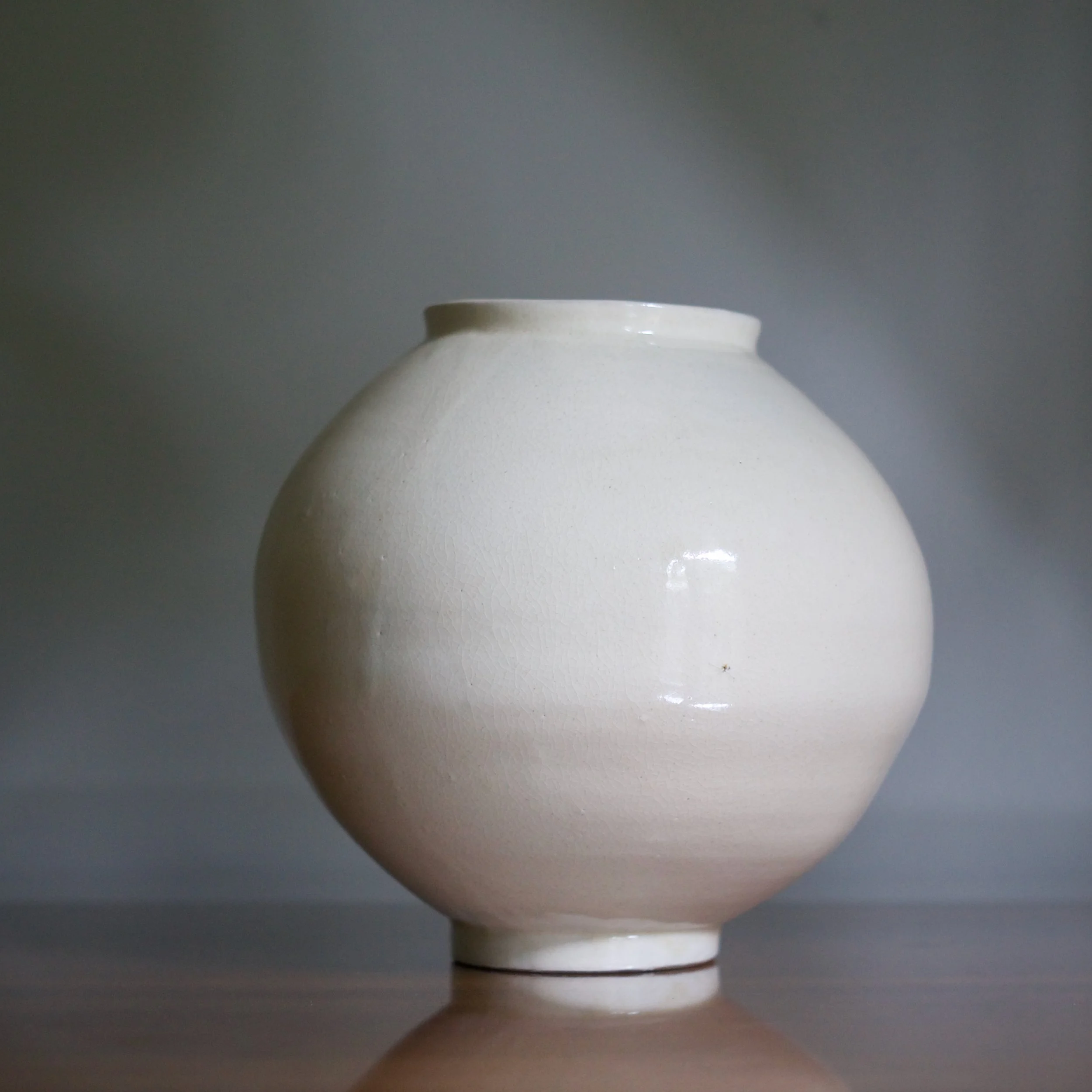 Like floating orbs, Yeon tae Park’s moon jars breathe with wobbly rhythm. Each one is unique, a record of its specific construction. Thrown in two separate parts - top and bottom - and then joined in the centre, a moon jar’s construction lends itself to a vertical asymmetry that has become a signature of the form. The diameter of the foot is also narrower than the mouth, adding an unstable tension.